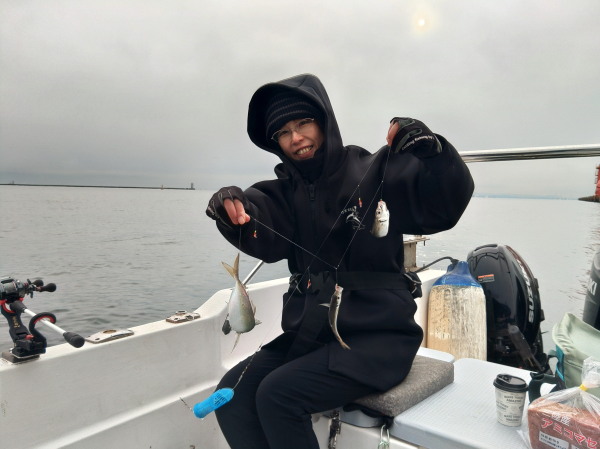 今日はMarukiさんの操船練習!毎年ご友人の方々と一緒に来られて、操船練習&釣りを楽しんでおります。発効前の点検、この辺の海域にも慣れてきている感じです。アジも釣れました。ご友人のTanaka さんは釣りが初めて、釣りの仕方などお教えして、釣り開始!口数が少ないと思ったら船酔い!ところが一番最初にヒット!その後皆さんも釣れ出した。昼から風が上がりだしたので、帰港へ、途中で離着岸の練習!もう一名船舶免許を持っているKoizumiさんも離着岸の練習をしました。二人とも綺麗に着岸で来たところで、帰港です。