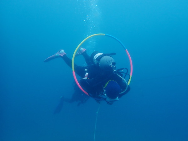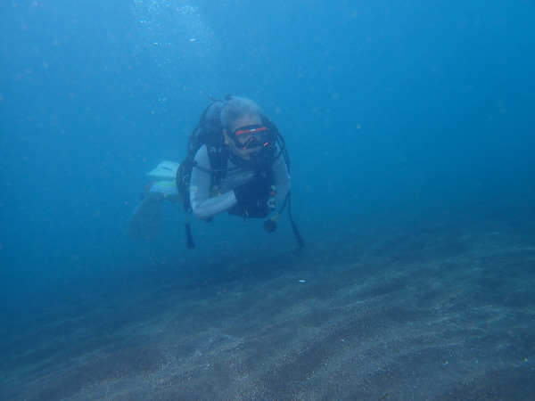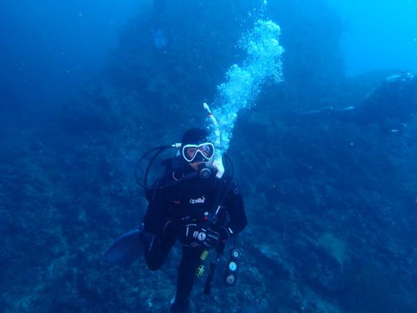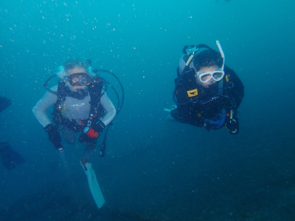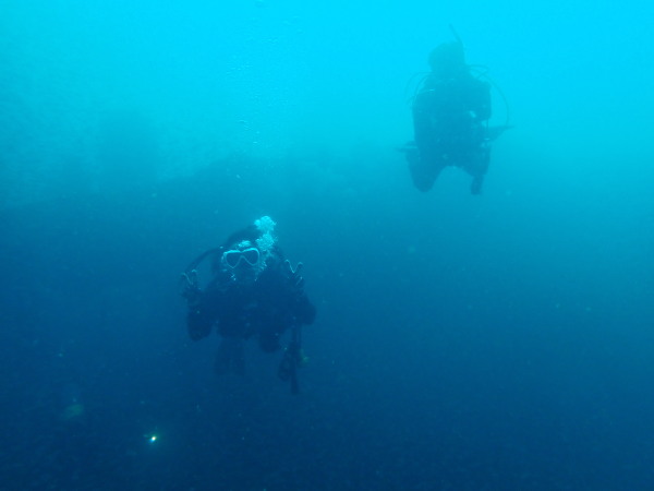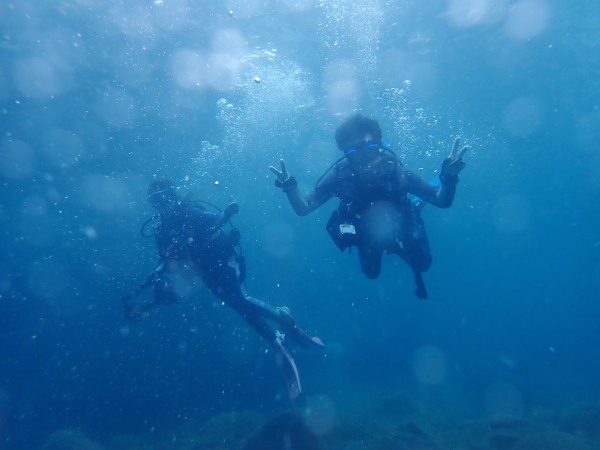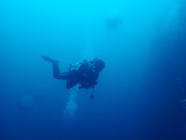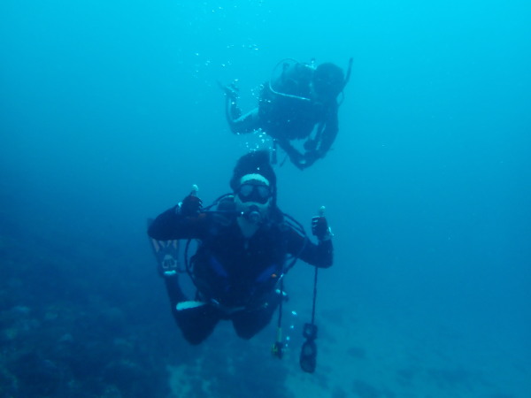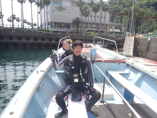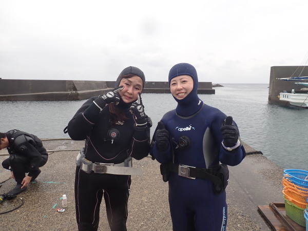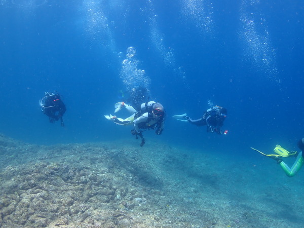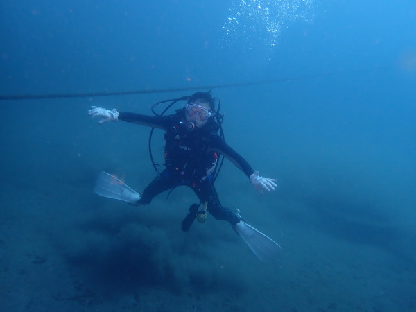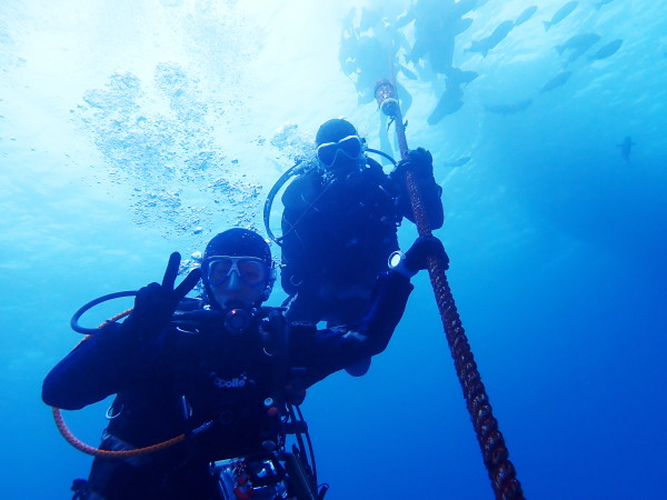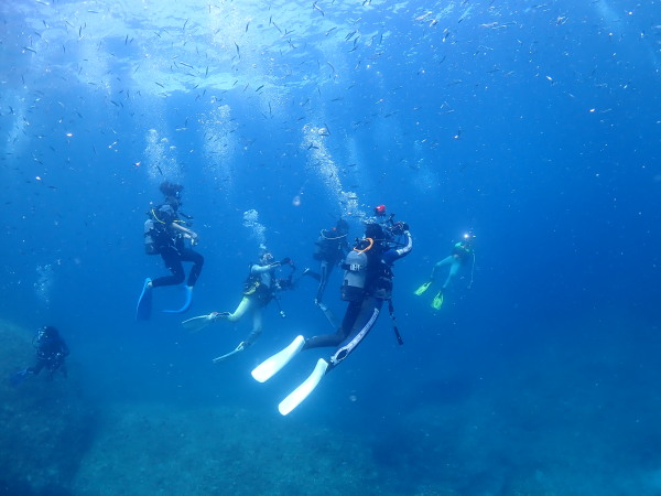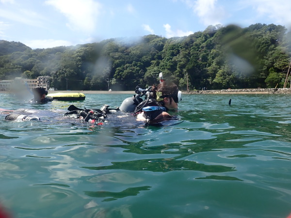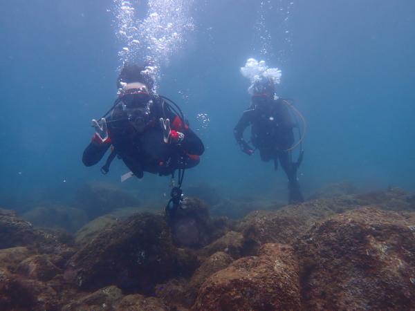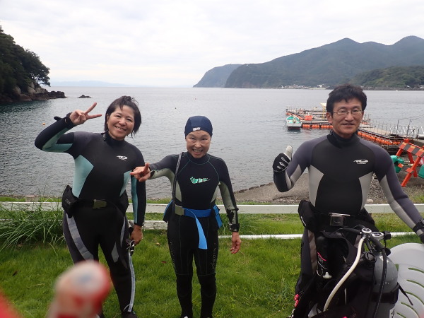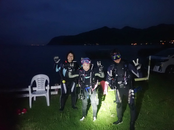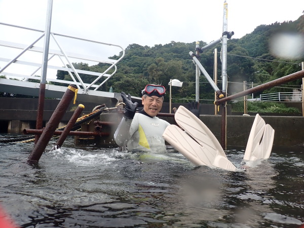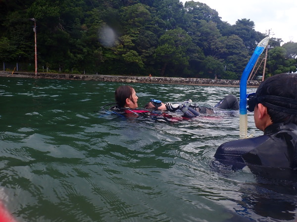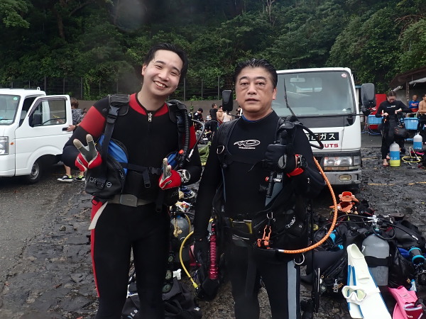 今日から土肥で先日OWDコースを受講したOzawaさんと先日ツアーに参加されたNaruiさんのAOWコースです。Naruiさんは100本ダイバーですが、今までAOW取得を薦められた事もなく、個人的にダイビング器材を持ち電車でコツコツダイビングを続けてきました。前回のFUNダイビングでAOWコースを薦めたところ、直ぐに『参加します』深度を見る計器もお持ちでなかったので、ダイブコンピューターもお勧めして購入、コースへの参加の準備をして頂きました。伊豆は大雨情報でしたので、行く事を迷いましたが、前日に前線が太平洋側に移動!少しの雨を覚悟して、土肥に行きましたが、その心配もなく、曇り空!土肥の海も穏やか!綺麗でした!ディープ!潜行すると物凄い数のボラの群れ(圧巻でした)続いて、ナビゲーション、コンパスには苦労していましたが、使い方が分かってくると問題なさそう、ナイトも楽しんでいました。夕食後はサーチ&リカバリーの為にロープワークの練習!Naruiさんは苦労していましたね。ロープを回すと説明!これが手お回すに変化!一同爆笑!翌日はお宝を二人で無事に回収!最後はPPBで中性浮力の練習。Naruiさんも中性浮力のコツが分かり中世浮力を取れるようになりました。Ozawaさんは何をやっても上手い!無事にAOWダイバーの誕生です。おめでとうございます!Akeiさん講習のサポートありがとうございました。流石DM候補(認定直前)!これからも皆さんでダイビングを楽しみたいと思います。既にOzawaさんは10月、11月のダイビングの計画を立てました。