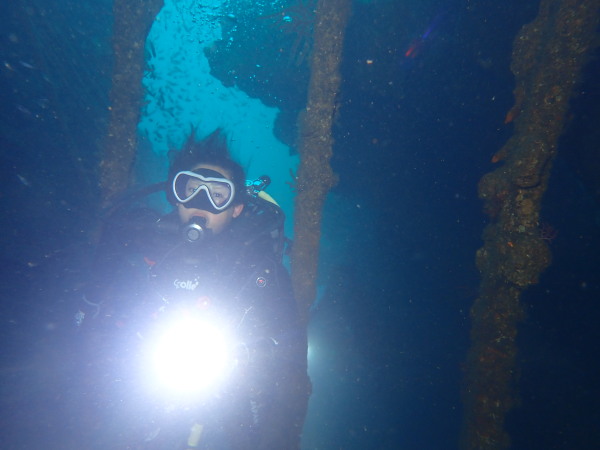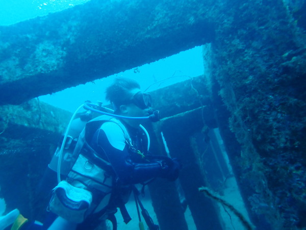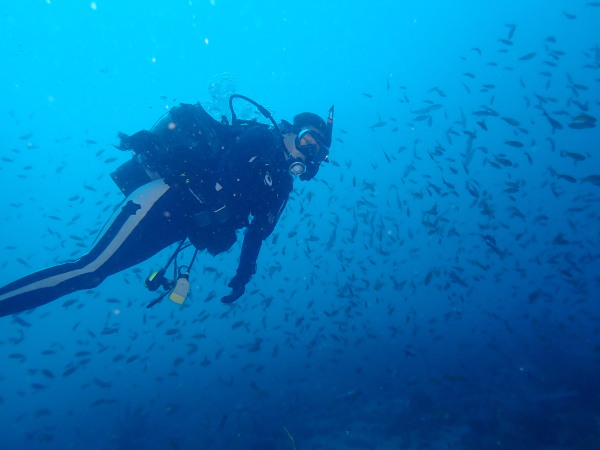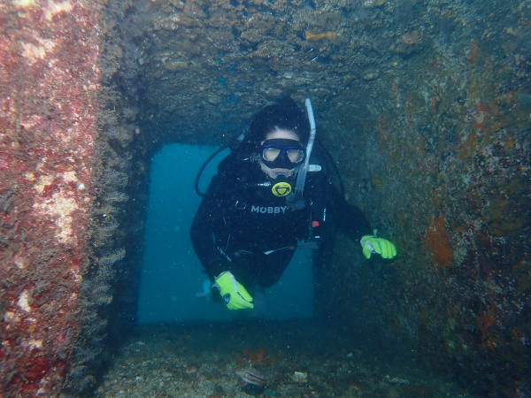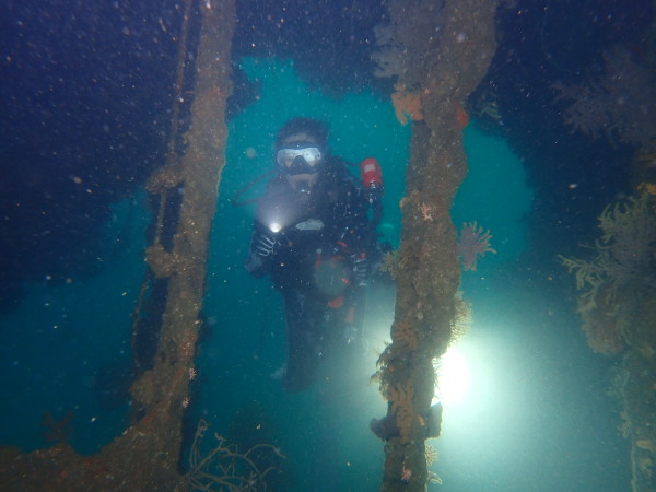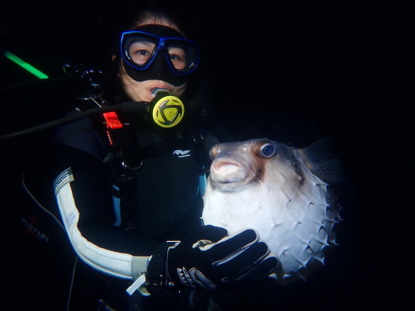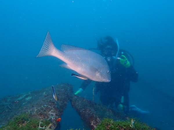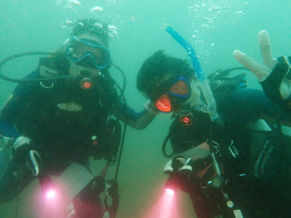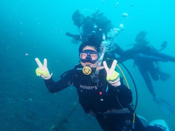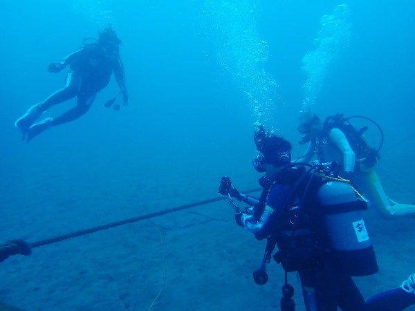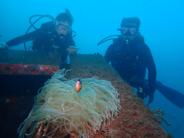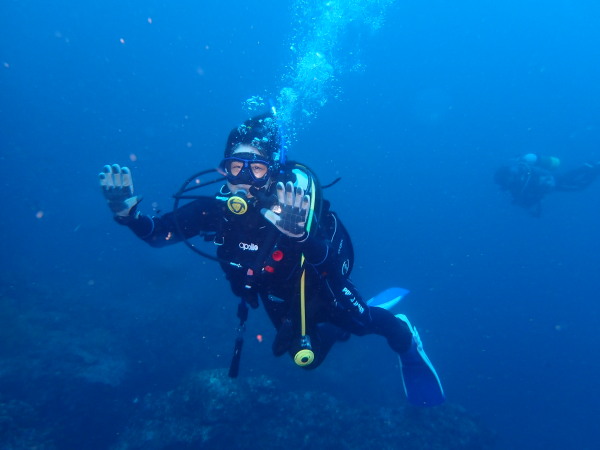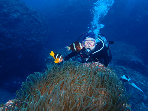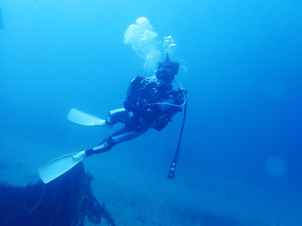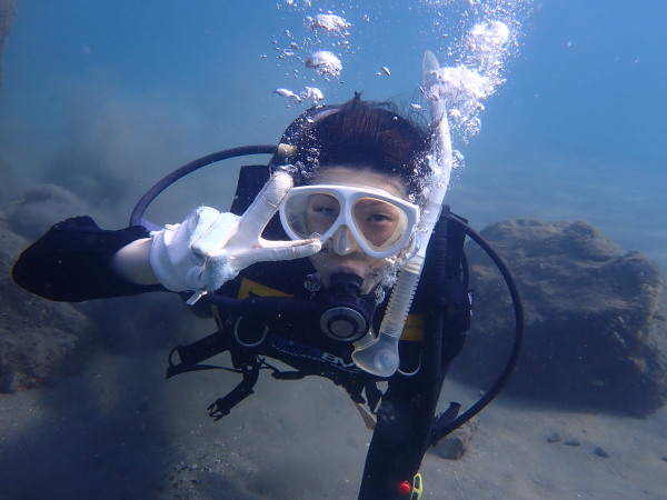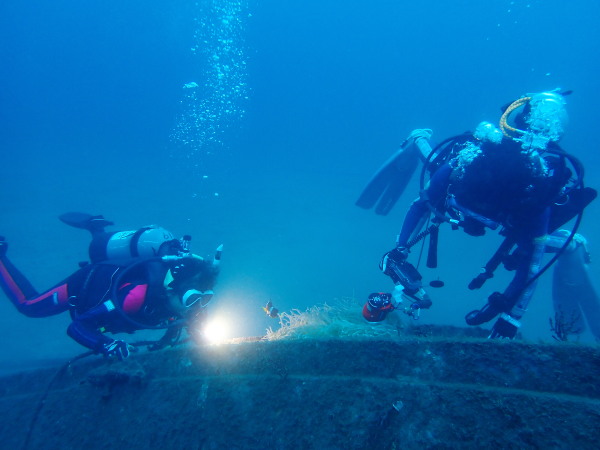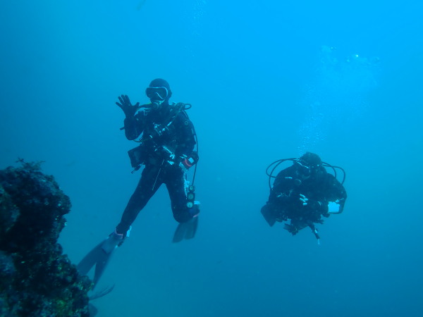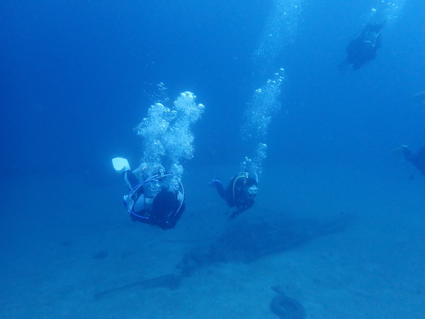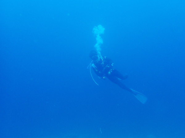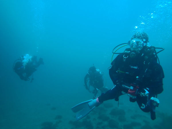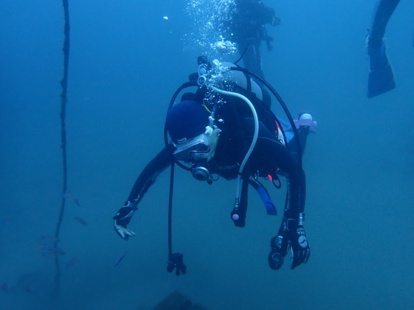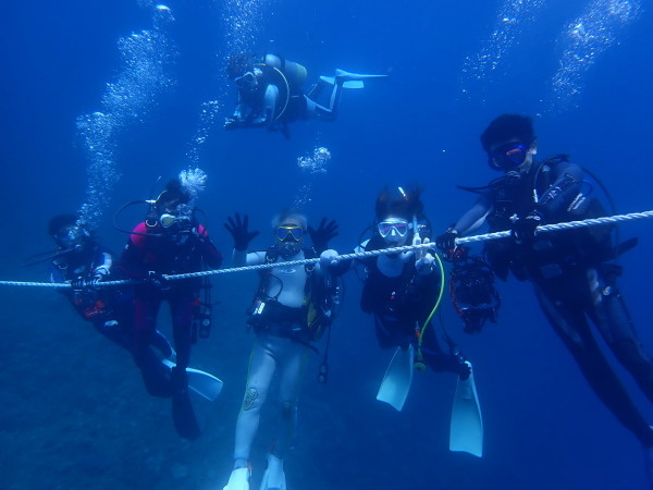 今日から土肥で先日OWDコースを受講したOzawaさんと先日ツアーに参加されたNaruiさんのAOWコースです。Naruiさんは100本ダイバーですが、今までAOW取得を薦められた事もなく、個人的にダイビング器材を持ち電車でコツコツダイビングを続けてきました。前回のFUNダイビングでAOWコースを薦めたところ、直ぐに『参加します』深度を見る計器もお持ちでなかったので、ダイブコンピューターもお勧めして購入、コースへの参加の準備をして頂きました。伊豆は大雨情報でしたので、行く事を迷いましたが、前日に前線が太平洋側に移動!少しの雨を覚悟して、土肥に行きましたが、その心配もなく、曇り空!土肥の海も穏やか!綺麗でした!ディープ!潜行すると物凄い数のボラの群れ(圧巻でした)続いて、ナビゲーション、コンパスには苦労していましたが、使い方が分かってくると問題なさそう、ナイトも楽しんでいました。夕食後はサーチ&リカバリーの為にロープワークの練習!Naruiさんは苦労していましたね。ロープを回すと説明!これが手お回すに変化!一同爆笑!翌日はお宝を二人で無事に回収!最後はPPBで中性浮力の練習。Naruiさんも中性浮力のコツが分かり中世浮力を取れるようになりました。Ozawaさんは何をやっても上手い!無事にAOWダイバーの誕生です。おめでとうございます!Akeiさん講習のサポートありがとうございました。流石DM候補(認定直前)!これからも皆さんでダイビングを楽しみたいと思います。既にOzawaさんは10月、11月のダイビングの計画を立てました。