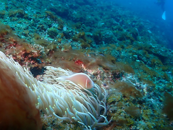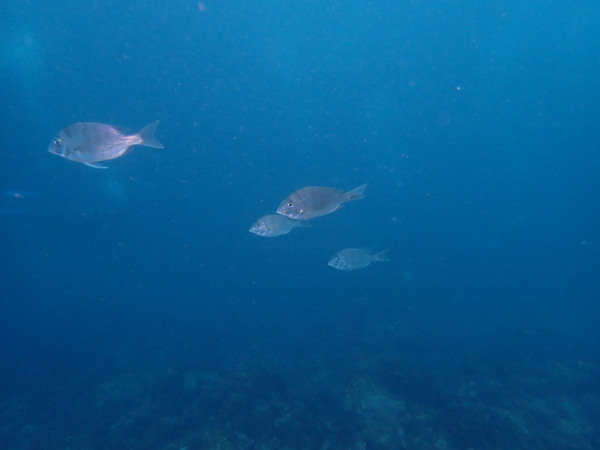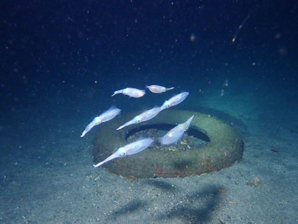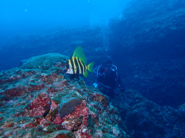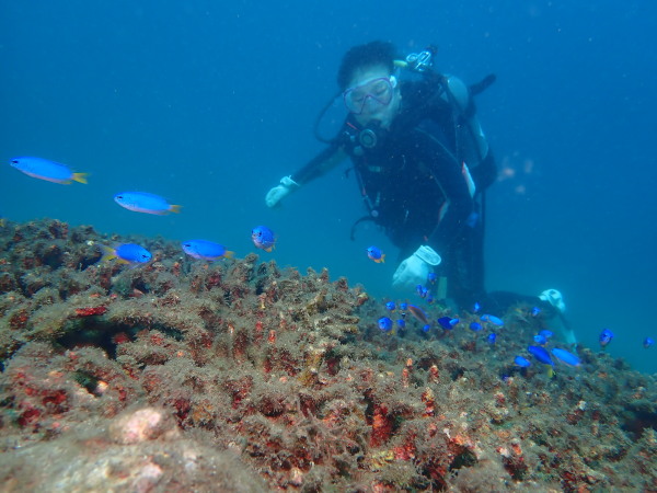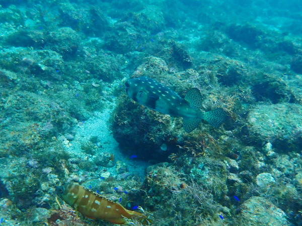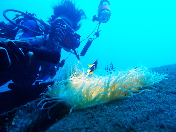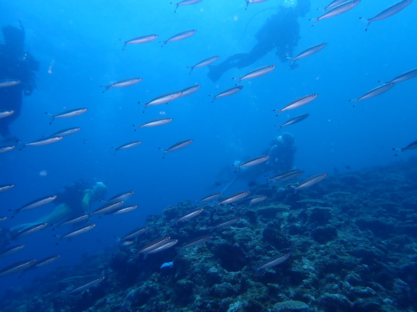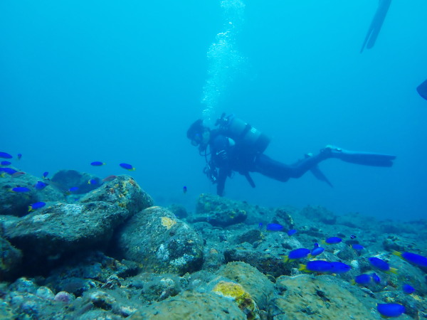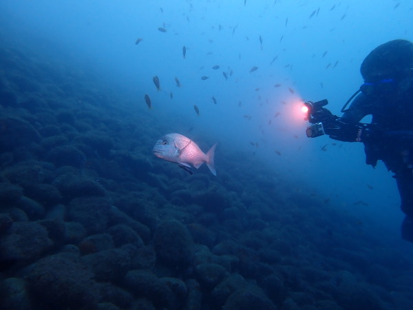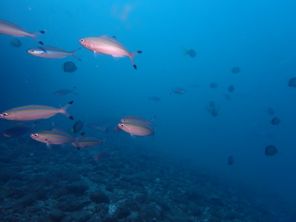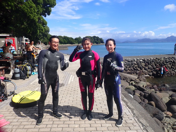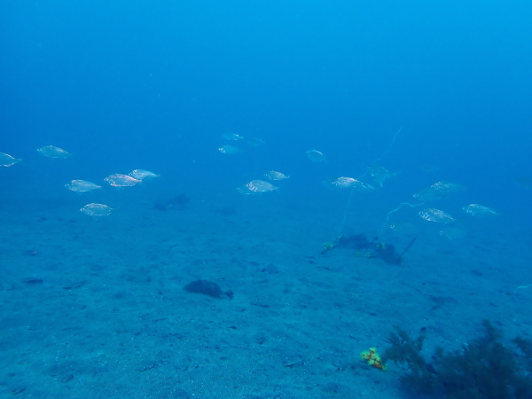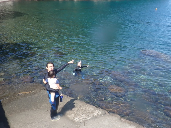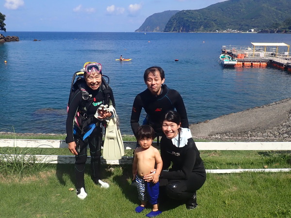 今日からYokomizo一家!初ツアー参加のNaruiさんと土肥に行ってきました。Yokomizoさんもダイビングが久しぶり、結婚してから潜っていませんでしたね。今回は息子のSora君の初海水浴、saoriさんの体験ダイビングです。Naruiさんは海外でCカードを取得後、行きつけのショップが無く、電車でダイビングに出かけ100本位の経験ダイバー!土肥は天気も良く!透明度も8m~15m位、水温27℃~28℃、凪状態の最高の2日間でした。水中は南の魚も多かったように思います。タカサゴの群れ、タカベと一緒に群れをなして泳いでいます。スジモヨウフグ、サザナミフグ、モンツキハギ幼魚(?)等、カンパチ、アジの群れ、アオリイカの子供達等も土肥ビーチにこんなに魚いるんだっけ!と感じるほど!エダサンゴも増えてきているようにも思います。YokomizoさんもNaruiさんも2日間ダイビングを楽しんでいました。saoriさんは体験ダイビングは余裕!是非、夫婦でダイビングをやって貰いたいですね。毎晩夜遅くまでお話もしていました!