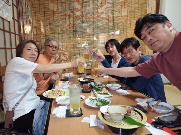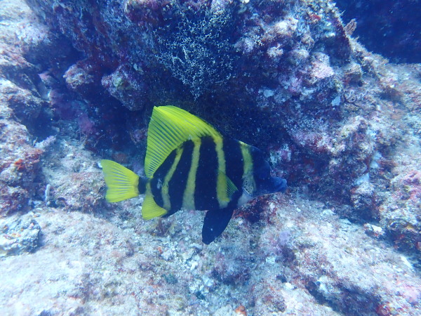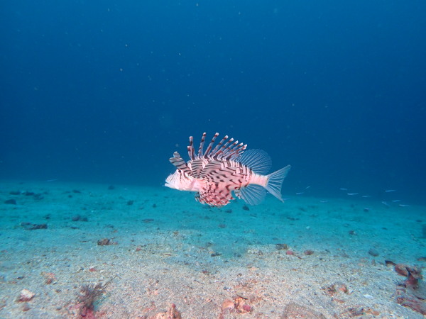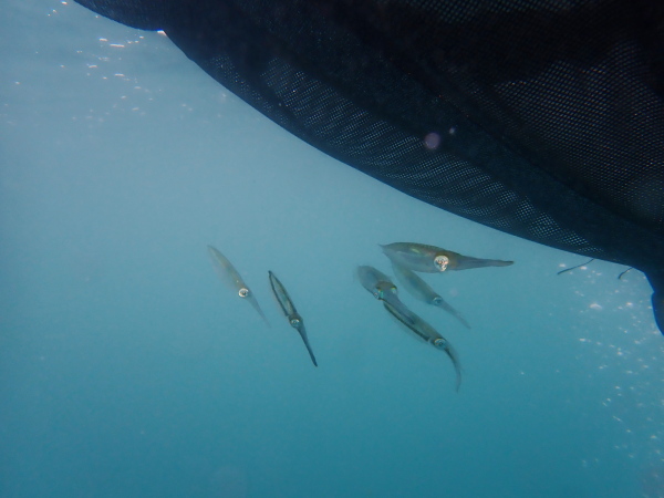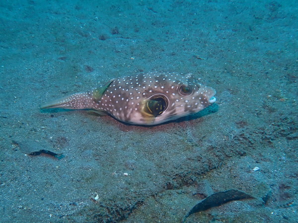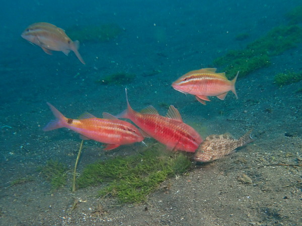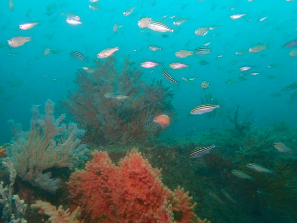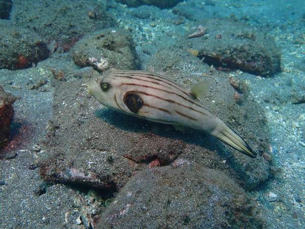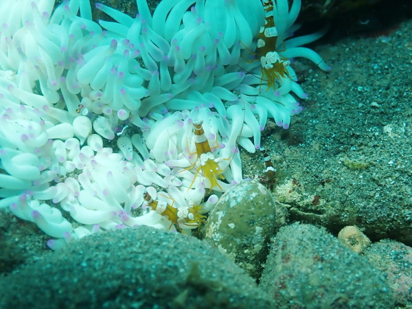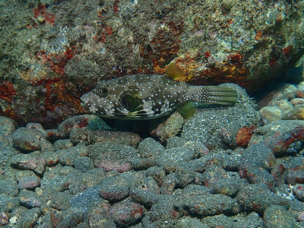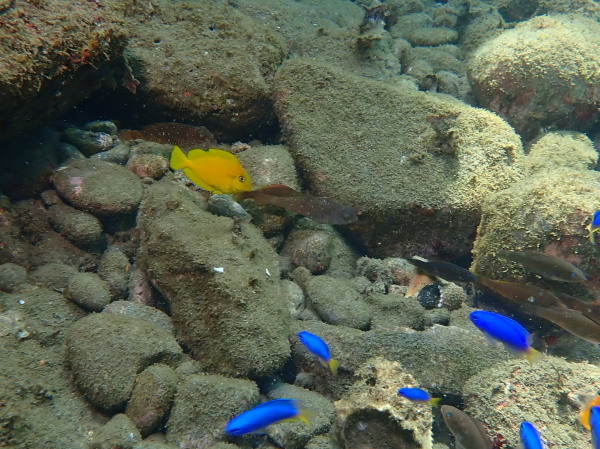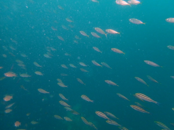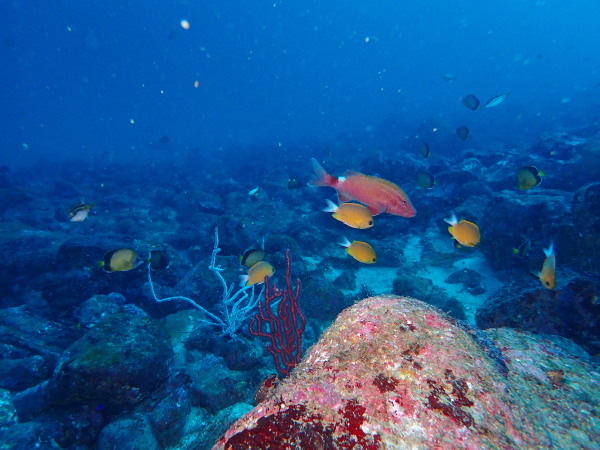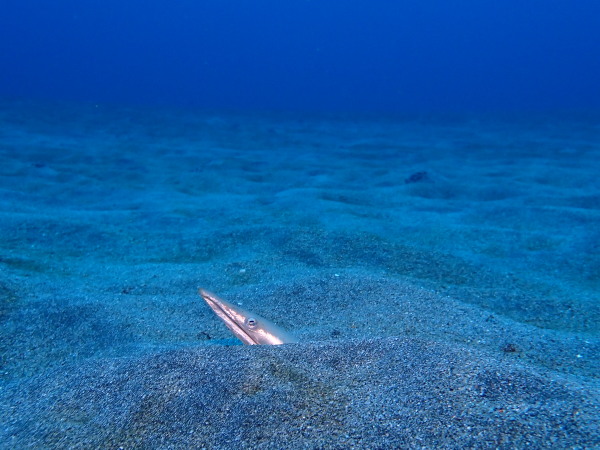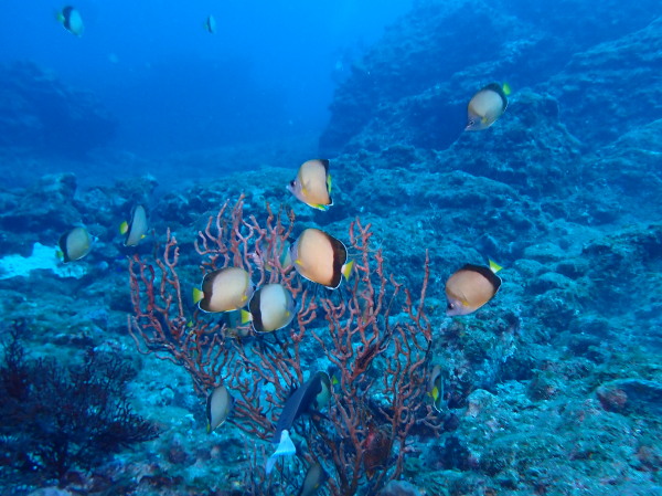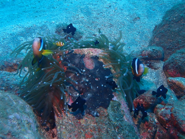 今日からYokomizo一家!初ツアー参加のNaruiさんと土肥に行ってきました。Yokomizoさんもダイビングが久しぶり、結婚してから潜っていませんでしたね。今回は息子のSora君の初海水浴、saoriさんの体験ダイビングです。Naruiさんは海外でCカードを取得後、行きつけのショップが無く、電車でダイビングに出かけ100本位の経験ダイバー!土肥は天気も良く!透明度も8m~15m位、水温27℃~28℃、凪状態の最高の2日間でした。水中は南の魚も多かったように思います。タカサゴの群れ、タカベと一緒に群れをなして泳いでいます。スジモヨウフグ、サザナミフグ、モンツキハギ幼魚(?)等、カンパチ、アジの群れ、アオリイカの子供達等も土肥ビーチにこんなに魚いるんだっけ!と感じるほど!エダサンゴも増えてきているようにも思います。YokomizoさんもNaruiさんも2日間ダイビングを楽しんでいました。saoriさんは体験ダイビングは余裕!是非、夫婦でダイビングをやって貰いたいですね。毎晩夜遅くまでお話もしていました!