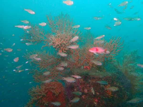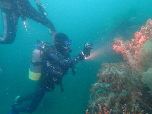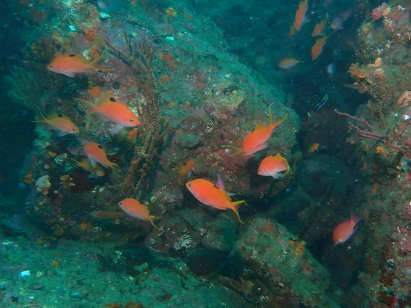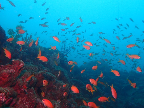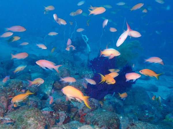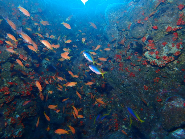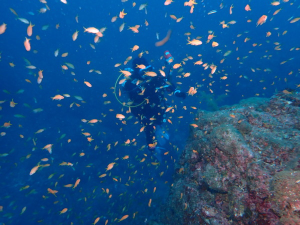 今日は、堂ヶ島に行ってきました。ここのところ堂ヶ島に行こうとすると風が強く。。やっと堂ヶ島の海を潜ることが出来ました。浮島根は田子のダイビングボートも4隻来ており、水中で他のダイバーの姿を見る事も多かったです。今年ここから皆さん衣替えでドライスーツに!毎年もっと早いのですが、今年は水温も気温も高かった事で、この時期になりました。浮島根はキンギョハナダイが一杯!他に魚を見たのかな?こんな感じの量でした。テングダイも居ましたね。今回ボートもドライスーツも初めてのOzawaさん、なかなかドライスーツに苦労をしていましたが、無事にダイビングを楽しんでいました。天窓洞は、曇り空で綺麗な姿を見れませんでしたが、堂ヶ島ダイビング楽しかったですよ。次回は来年天気の良い日に行きたいものです。