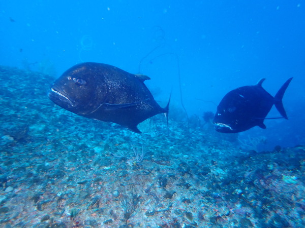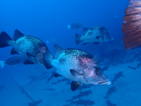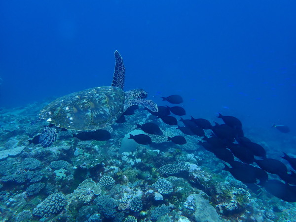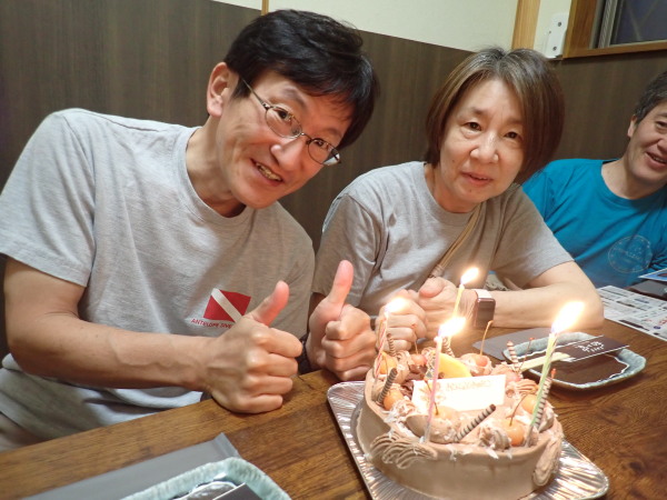 GWの始まり!昨年に続き徳之島へ行ってきました。今回は大物狙い!天気が気になりましたが、着いた日は晴れ、翌日も晴れのち曇り、最終日は少し雨が振りましたが、全ての日程で夜食事に行く時等ダイビングスーツを脱ぐと雨にも当たらず!ラッキーでした。小潮で潮が流れていませんでしたが、風があり。。。大物ポイントには行けませんでしたが、でも1本目からイソマグロの群れに遭遇!20~30匹はいたようにも思います。水温も23℃~24℃と丁度良く、最初の2日間は少し白濁りの様な感じですが、最終日は抜けました!カメも多く、カマスの群れも!夜は地元のお店で食事を堪能!ホテルには、昨年も行きましたが、『海風』があります。まずは此処から!海も食事も楽しんできました。最終日は、中流級の闘牛を見に行きましたが、物凄い人でした。迫力も満点!ツアー中にSumidaさん、Akeiさんの誕生日!ケーキ―でお祝をしました。最後の最後に昨年も行きましたが、ロゴハウスのお洒落なお店でコーヒータイム!
