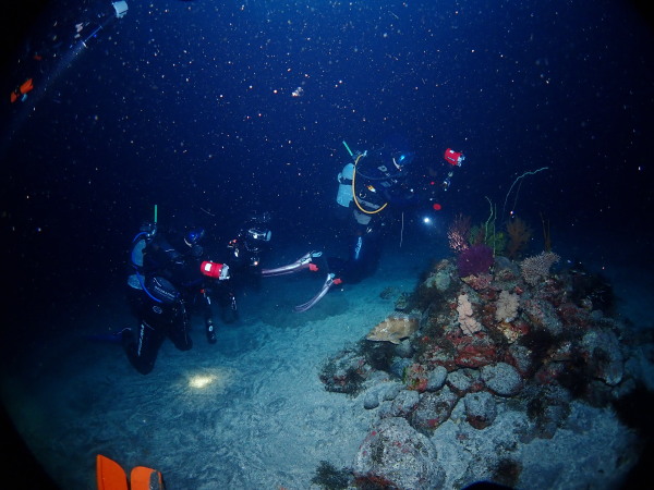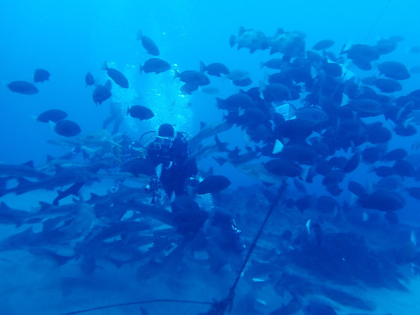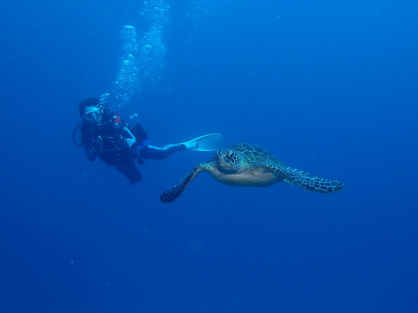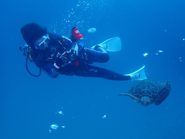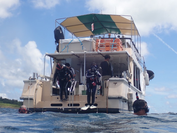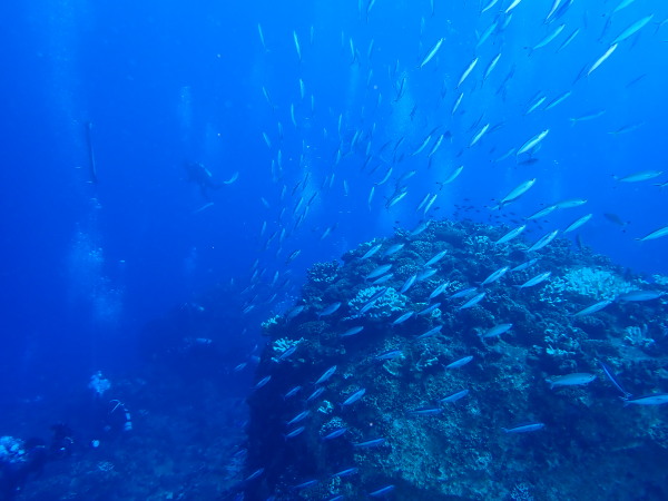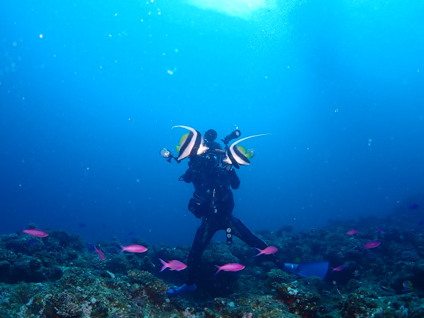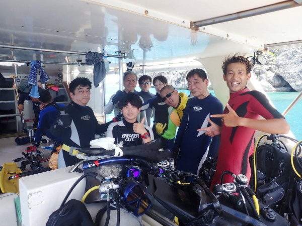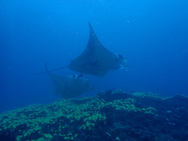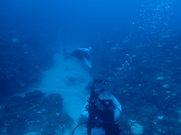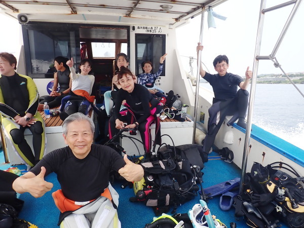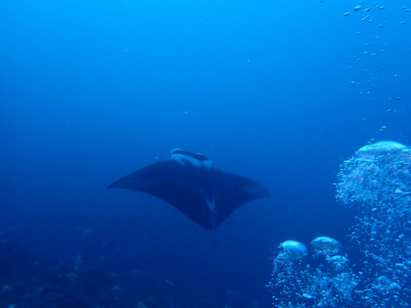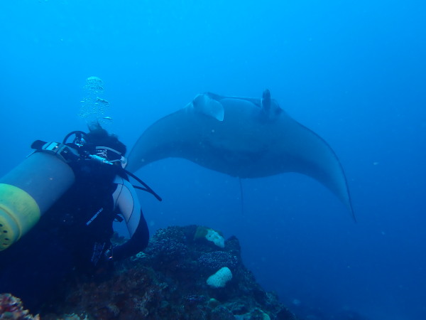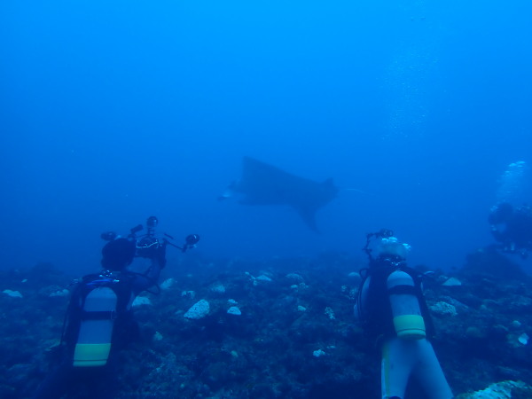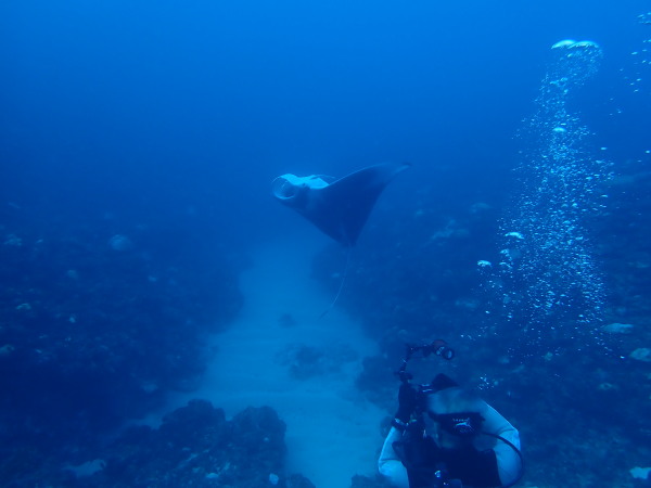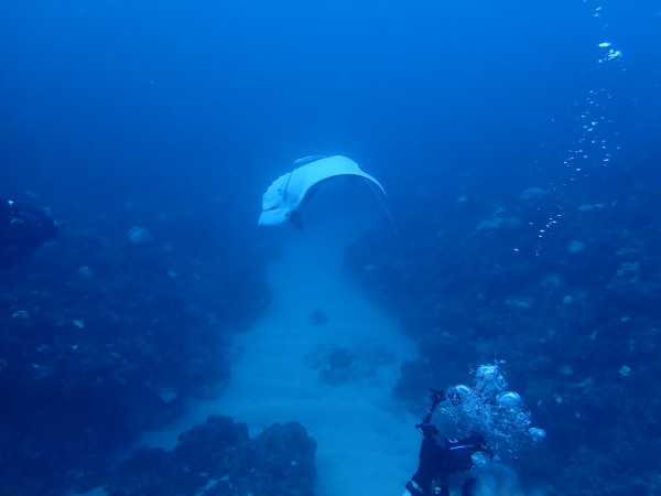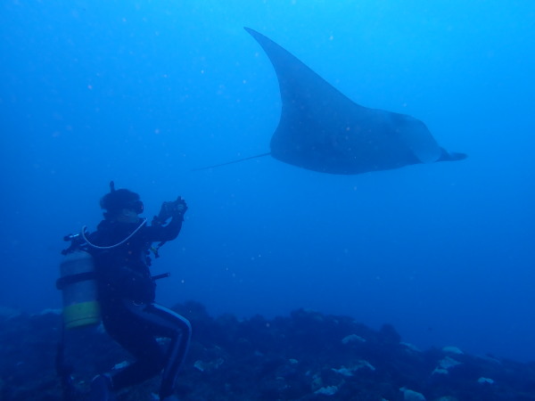 今年の久米島はひやひやでした。台風21号が発生して、台湾方面に!運良く1日に温帯低気圧に変わた!でもうねり等も有るので、2日はダイビングは無理かな?現地に着かないと分からない状態!久米島空港でスタッフに合い、聞いたところポイントは限定されますが、船は出ています!ラッキー!限定されて行ったポイントがマンタステイション!2ダイブをしましたが、マンタがいる。船に戻るところで小マンタが目の前で宙返りの泳ぎも見せてくれました。お腹一杯になる位マンタを見れました。夕食は地元の居酒屋へ、沖縄料理を堪能、流石に初日は皆さん早く寝て翌日に備えました。2日目からも天気が良く、トンバラにも行き、ギンガメの群れ、イソマグロ等など見れ、夜は浜辺に出て満点の星空を見学!3日目は晴天、雲は何処にもありません、またまたマンタステーションに!クロマンタがみたい!出た!3本目には、Shimizuさんの500本記念ダイビング!皆さんで御祝をして、シャンパンシャワー!無事に3日間久米島の海を楽しませて頂きました。何やらまた台風が発生したよう。今年の久米島ツアーは本当にラッキー感じでした。また次回久米島に!