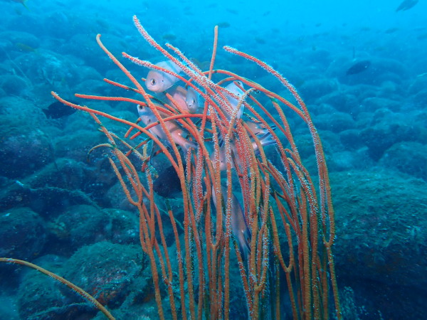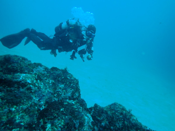 今週末はOWD海洋実習の予定でしたが、参加者が体調不調で延期となり、折角だから一日でも海に行こうとの事になり、熱海に行ってきました!天気も良く、気温も高く、海もべた凪!後は海ですが、残念。。透明度は5m~8mでしたが、魚は一杯!ネンブツダイ、イサキ、アジ、シラコダイ等は群れでいます。魚の数が多いだけに透明度が良ければ最高だったと思います。でも熱海の海は面白いですね!沈潜も楽しいです。今回は2本目ソウダイ根では無く、ビタガネを潜ってみました。久しぶりに潜ると良いですよ。帰り支度をして、さあ!昼食をとの事で車で移動。。。あ!カメラを忘れた!との事でセンターに引き返すと寂しそうに水槽に2個のカメラが!忘れ物にはくれぐれも気を付けましょうね。お祭りも終わってこれからがウポポ賊もダイビングに集中しますよ!
