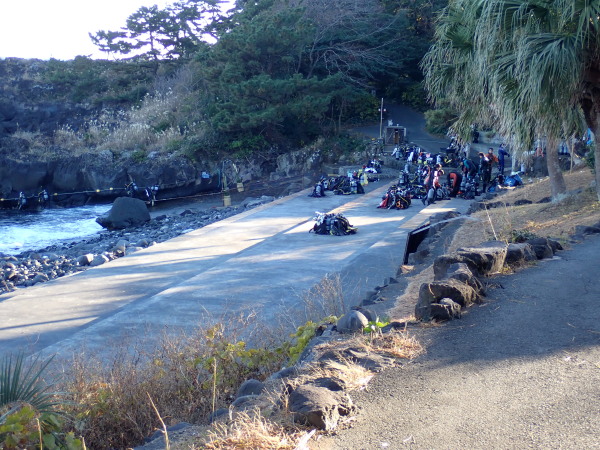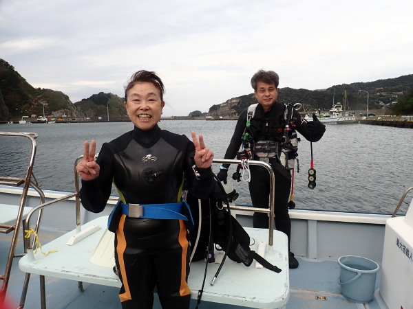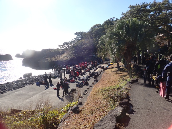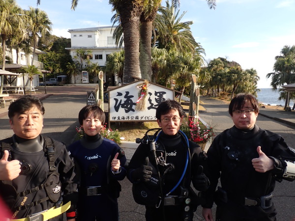 新年のダイビングもここ大瀬崎からです。まずは大瀬神社に安全潜水の祈願に行きました。天気も良く、水温17℃、透明度15m以上と最高のダイビング日よりでした。残念なのは1ダイブ目から私のDRYスーツが水没!戻りDRYを確認したところ、ブーツに穴が空いていました。年末の多摩川での作業で空いたのかもしれません。トホホ・・しかし、気温も高く、水温も高かったので耐えられました。それより海が綺麗でした。透明度が良いから魚達も多く見れて、冷たいより楽しかったです。Akeiさん、Mishimaさん、takashimaさんも楽しんでいました。マンボウさんでお正月との事で年末突いた御餅を頂きました。美味しかったです。感謝!ショップに戻り、Akeiさん、takashimaさんは、今年1年間のツアー参加スケジュールも決定!確定スケジュールはツアースケジュールに早速アップさせて頂きました。
