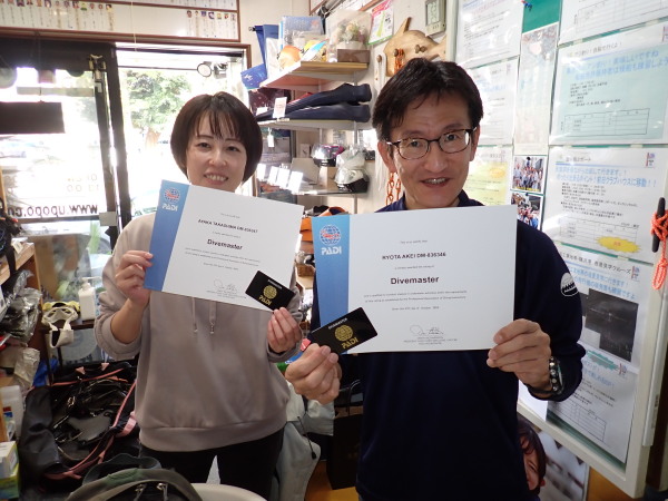 ダイブマスター2名認定です。おめでとうございます。私の現役最後のダイブマスター認定はKInugasaさんだと思っておりましたが、昨年Takashimaさんが、『なべさんがダイビング引退したら私たち潜れなくなる!潜れるようにしてよ!』この言葉からダイブマスターコースへ!TakashimaさんもAkeiさんもベテランダイバー既にバディ潜水が出来るレベル、しかし、自信が欲しかったのだと思う。どうせなら友人を連れて潜れるダイブマスターコースをやったら如何?との事から昨年から時間を掛けてダイブマスターコースを開催しました。当たり前のスキルを忘れていた事も多く、コースで基本に戻ってスキルを見直した事は凄く良かったと思います。不安げな初ポイントでもガイド役など苦労はしていましたが、乗り越えてダイブマスター認定です。お二人のガイドでダイビングをする事もあると思います。どうせならインストラクターになっては?との話もしています。 ダイブマスターに相応しいダイバー達です。