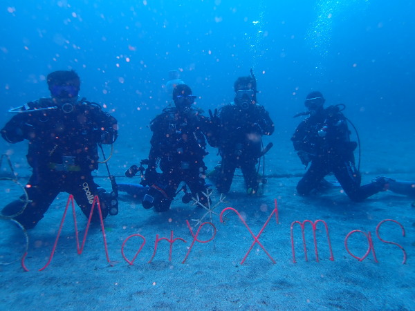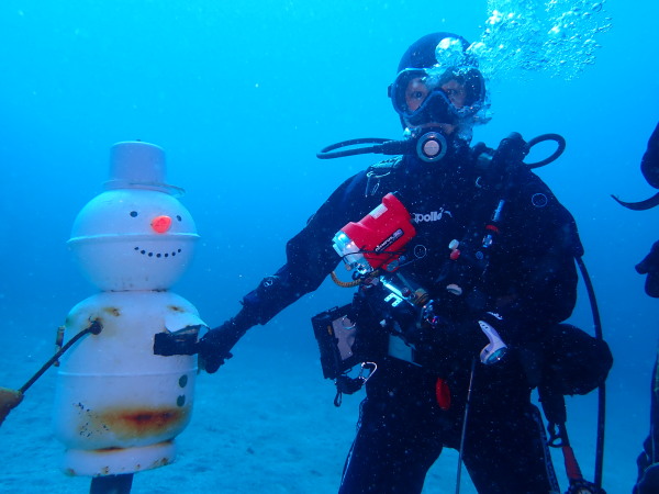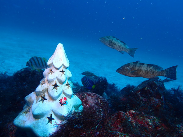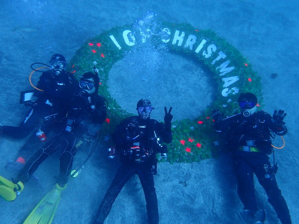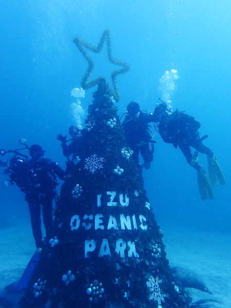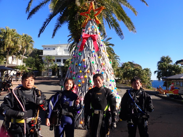 今日は、クリスマスツリーを見たいとの事で、IOPへ行ってきました。園内はクリスマス飾りで一杯!西風が強かったせいなのか?IOPはダイバーで一杯でした。気温は低いとの事でしたが、天気も良く、風も余りない。日向に居ると温かい、透明度も15m以上でしたので、気持ちの良いダイビングが出来ました。砂地ではガーデンイールや、カスザメも見れて、久しぶりの砂地も面白かったです。巨大なツリー!ダルマのポスト!等など海の中も楽しかったです。 エントリー口など浅場はダイバーだらけ、2ダイブ目は二の根に行きましたが、こちらはダイバーが居ない!人懐っこいコブダイがよってきましたよ!akeiさんの写真を。。。2ダイブ目カメラを忘れて潜ってしまいました。久しぶりDRYスーツを着るKomiyaさんも自由にダイビングを楽しんでいました!今年も後2週間!最後の最後で恒例の大晦日IOPにも行きます。Akeiさん700本、Takashimaさん400本の御祝ダイブもあります。