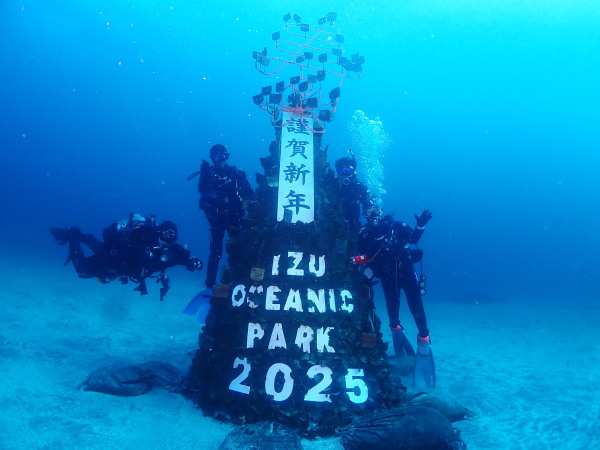 今年も大晦日はIOPへ行ってきました。例年に比べてダイバーが少なかった!天気も恵まれ、意外と日向にいると温かい!風が強かったですが、やはり海の中は静か、クリスマス飾りがお正月飾りに変わっており、日中2ダイブした後は、伊豆高原駅に観光?車の中でお昼寝をして、ナイトダイビング!その前にナイトダイビングで、Akeiさん700本、Takashimaさん400本の記念ダイブにもなりますので、エントリー前にお祝のシャンパンシャワー!無事に記念ダイビングも出来ました。初めて見るような大きなカエルアンコウも見れ、ダイバーが少なかったので、本当に綺麗な海を潜り、2024年を締めくくることが出来ました。来年も良いダイビングが出来る事を祈って!
