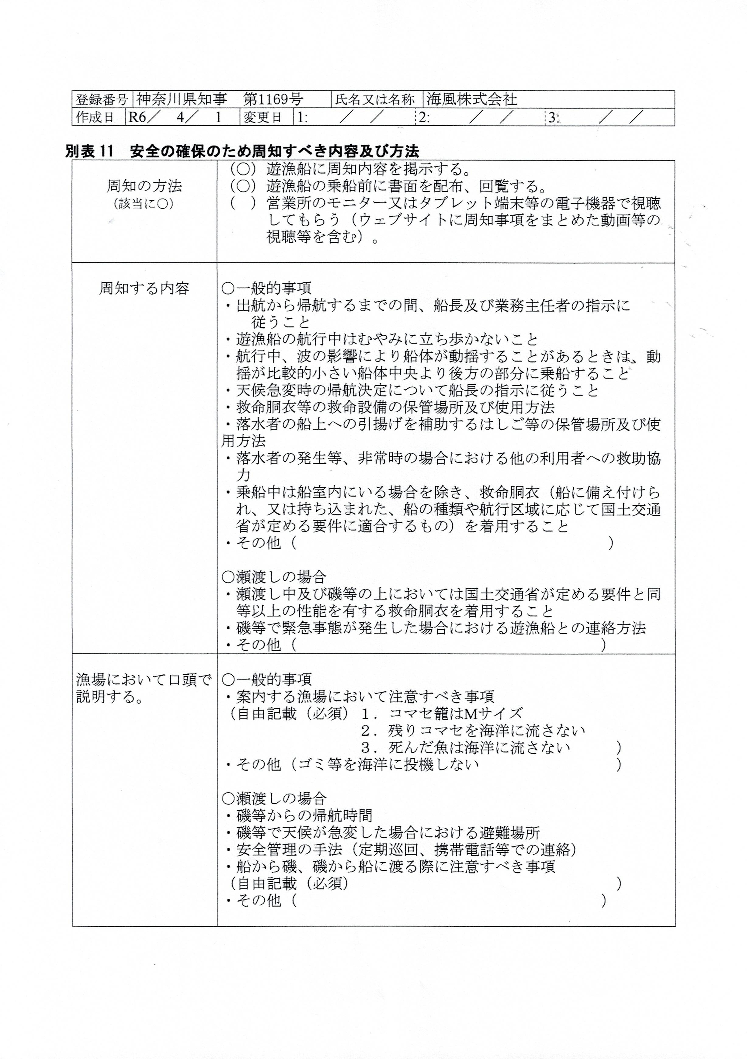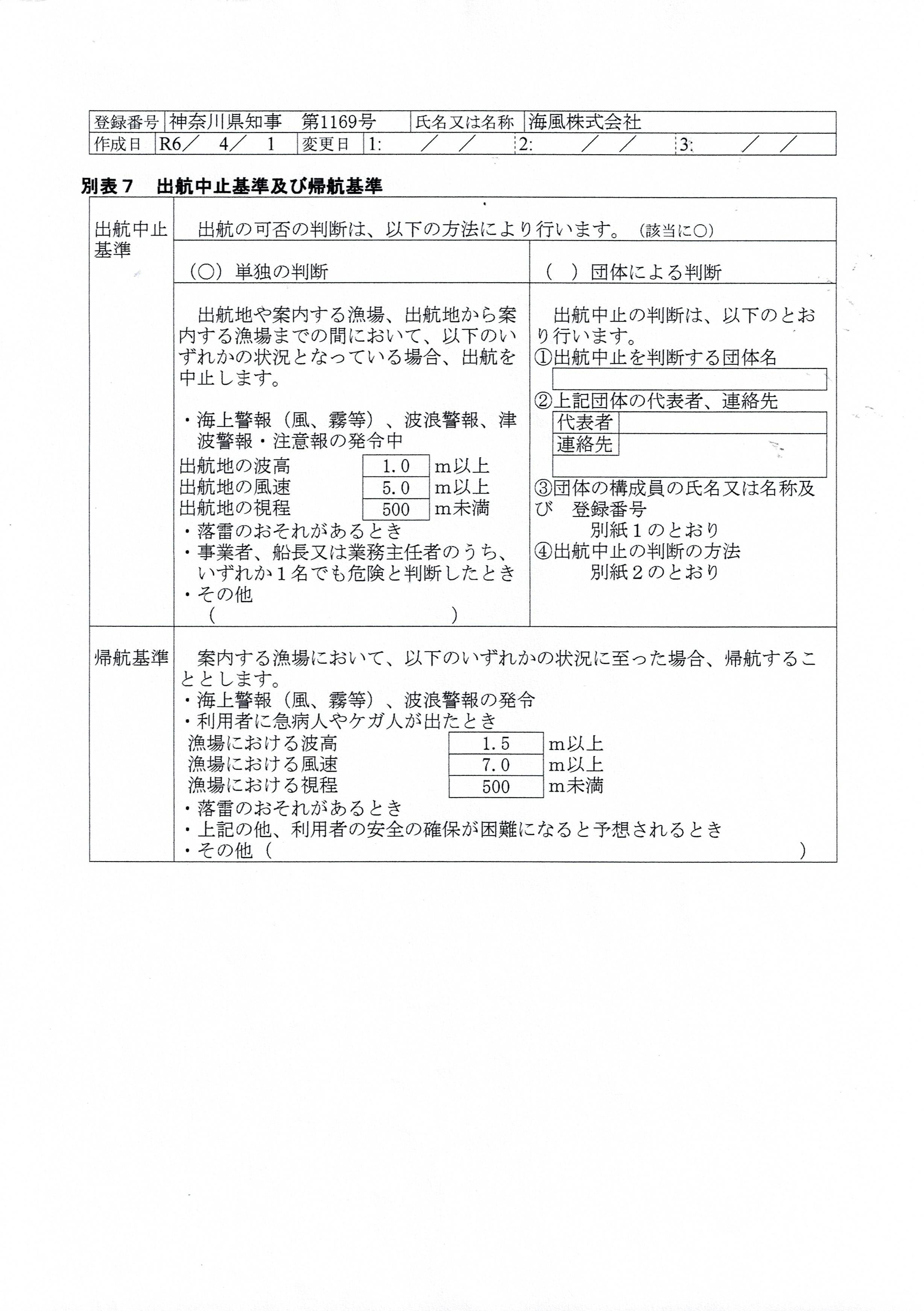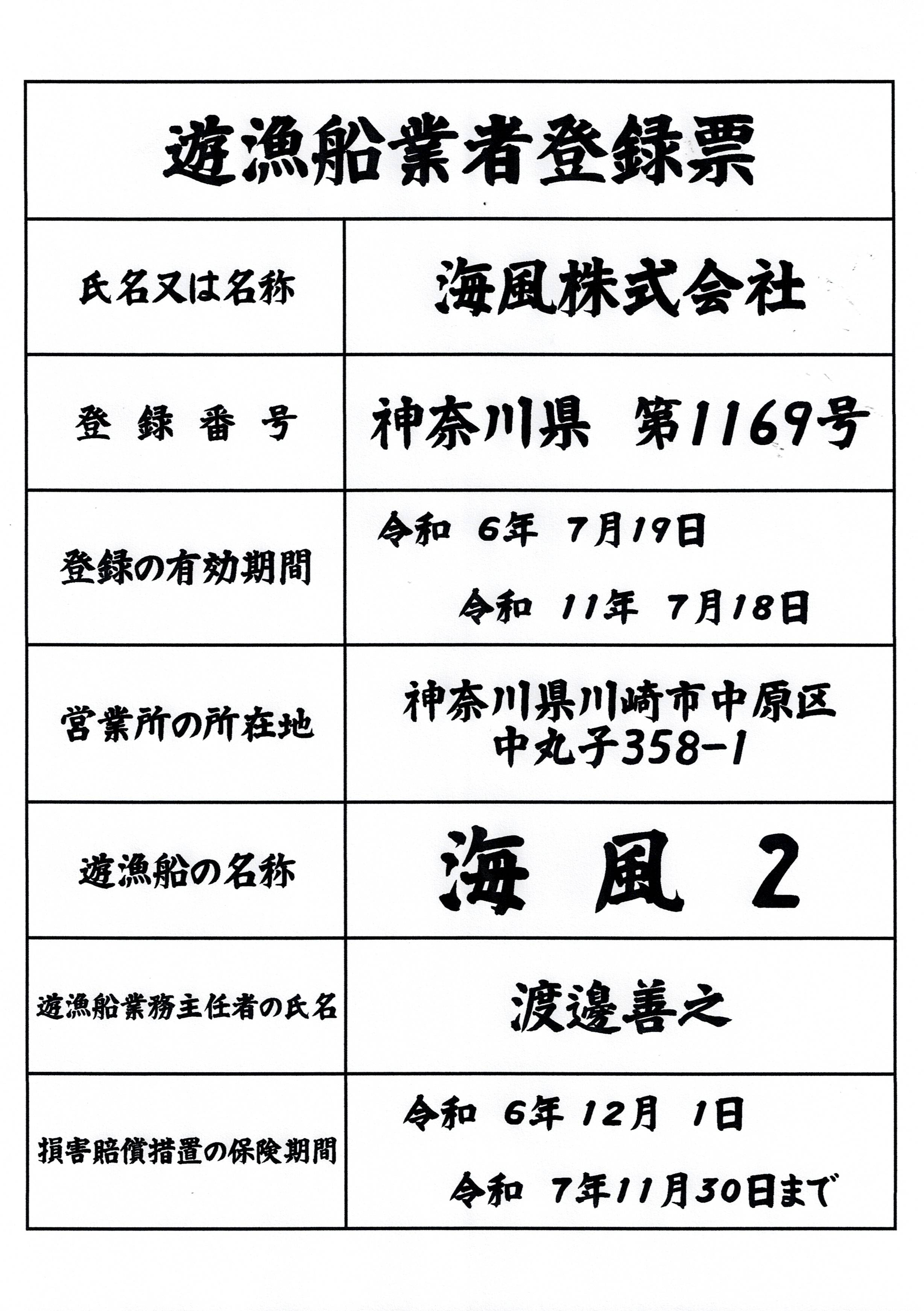 遊漁船業の適正化に関する法律第17条の規定及び弊社業務規程の規定に基づき、以下のとおり弊社業務規程と遊漁船業者登録標識を公示しています。
